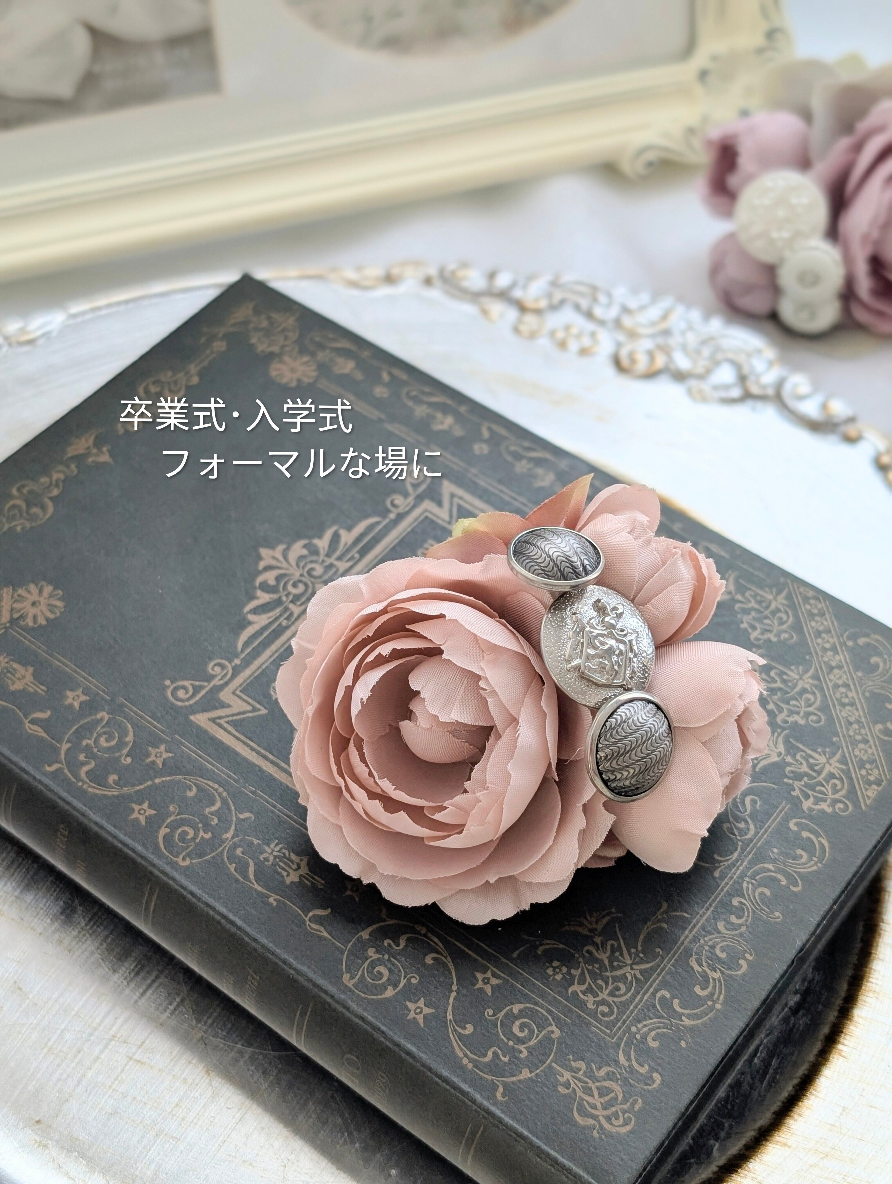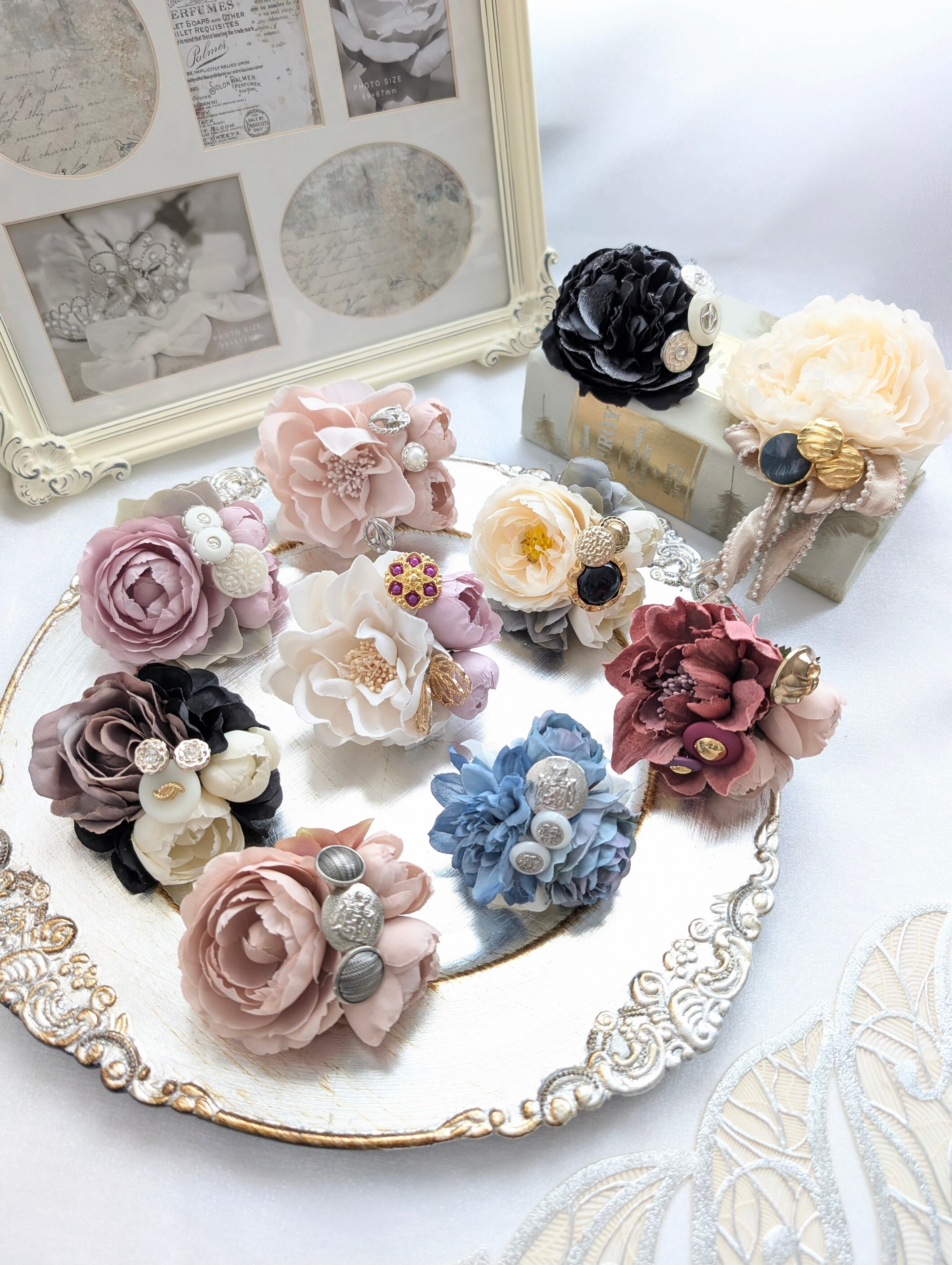 造花とボタンのバランスを大切に、落ち着いた色合わせで、ひとつひとつ丁寧に仕立てました。