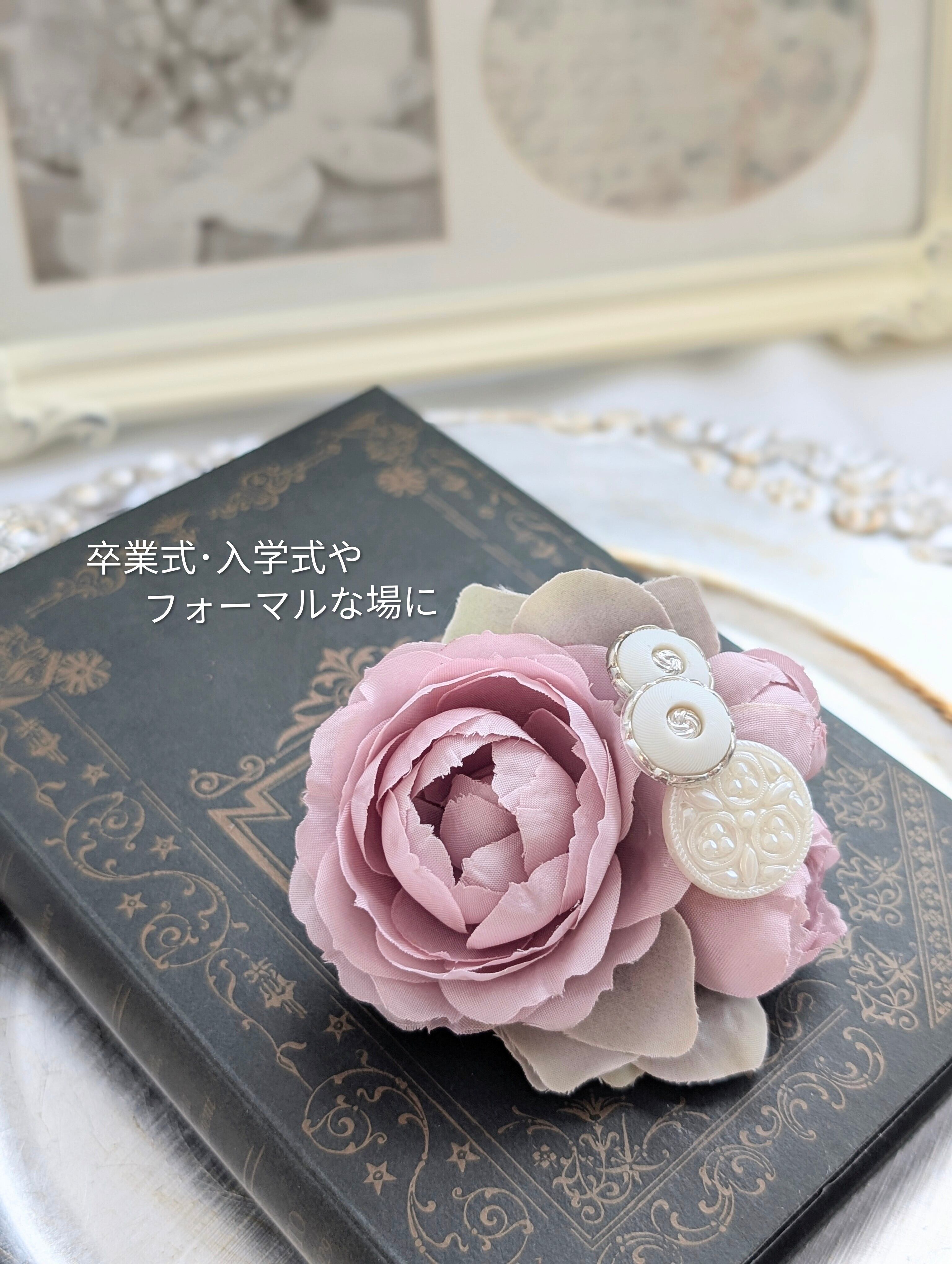 造花とボタンのバランスを大切に、落ち着いた色合わせで、ひとつひとつ丁寧に仕立てました。
