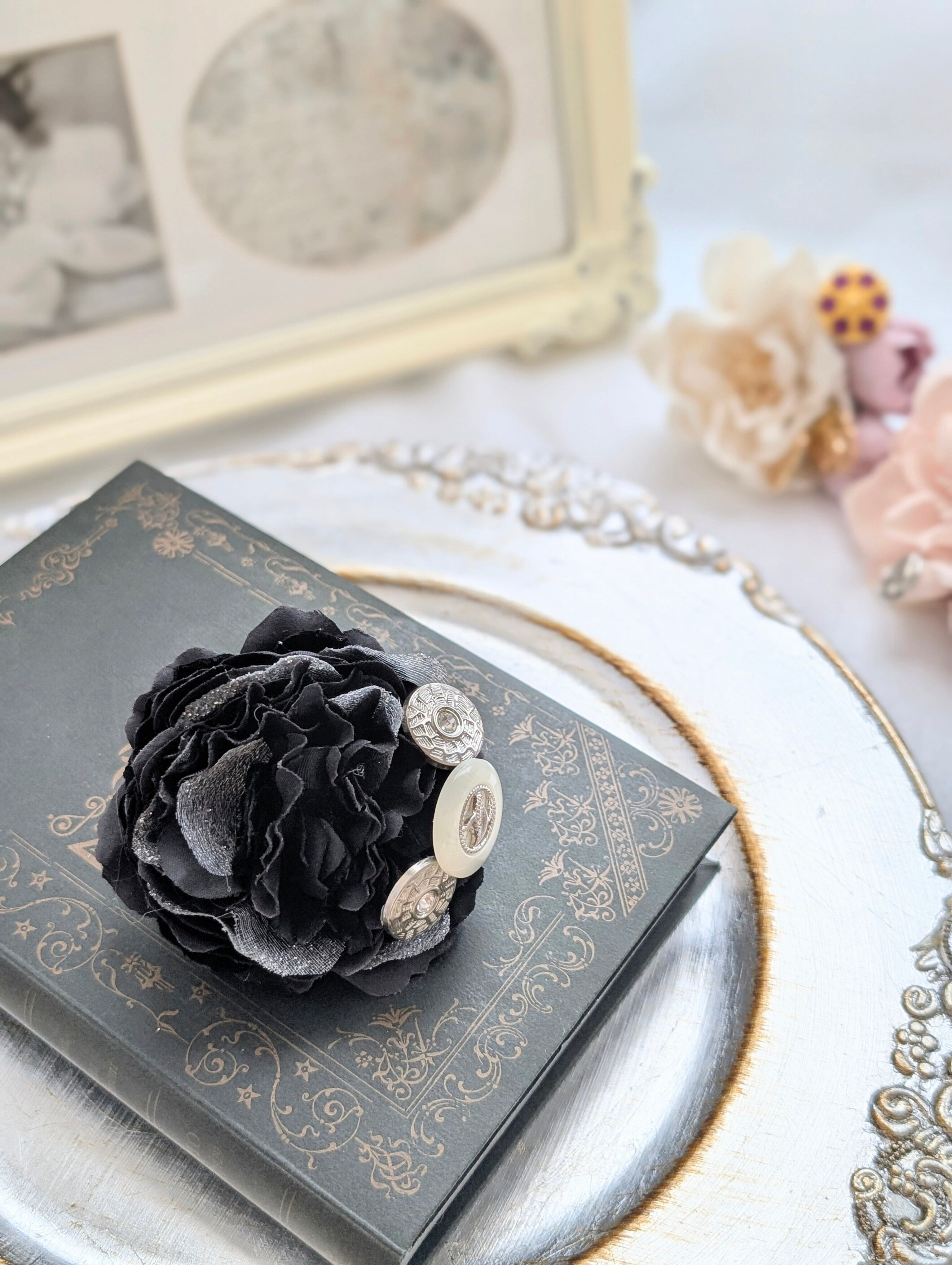 上質な造花と異なる表情を持つアンティーク調ボタンを組み合わせたアトリエオリジナルデザイン。