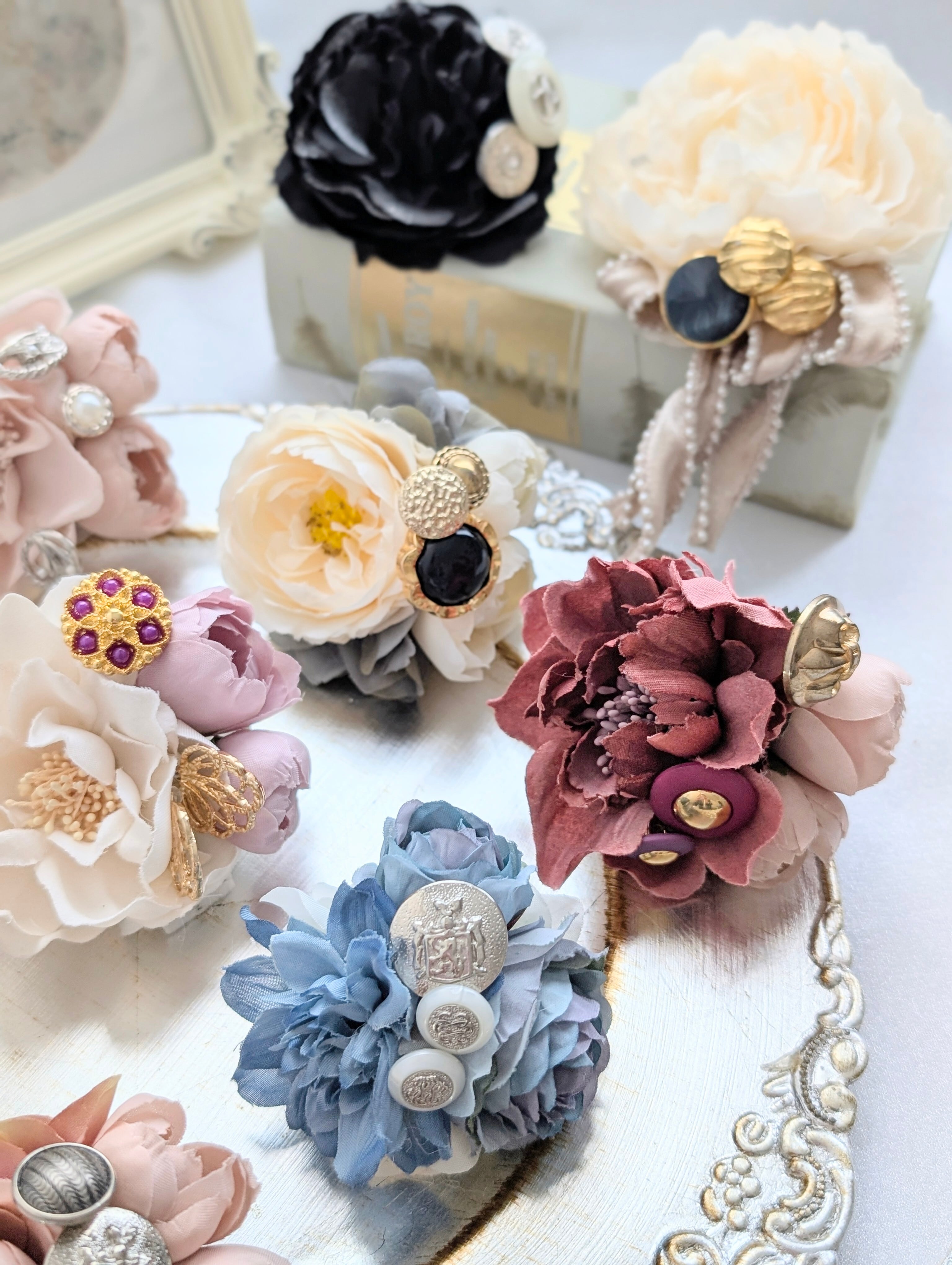 造花とボタンやリボンのバランスを大切に、落ち着いた色合わせで、ひとつひとつ丁寧に仕立てました。